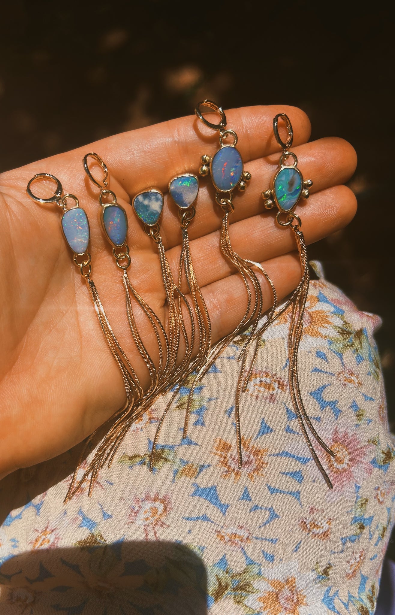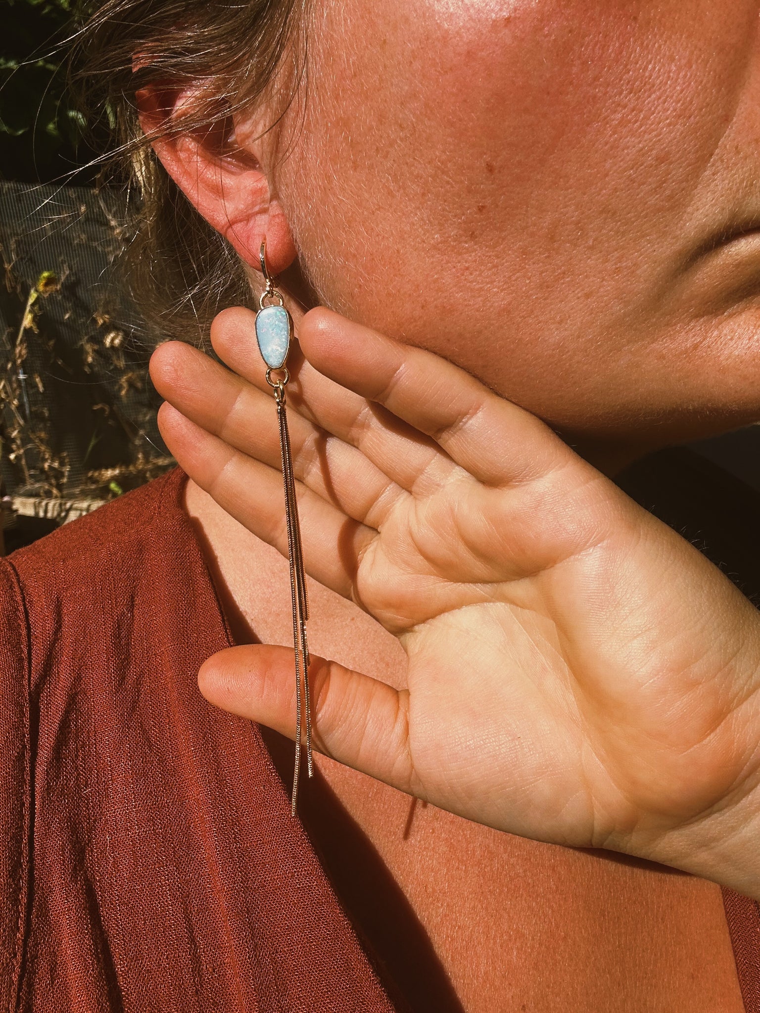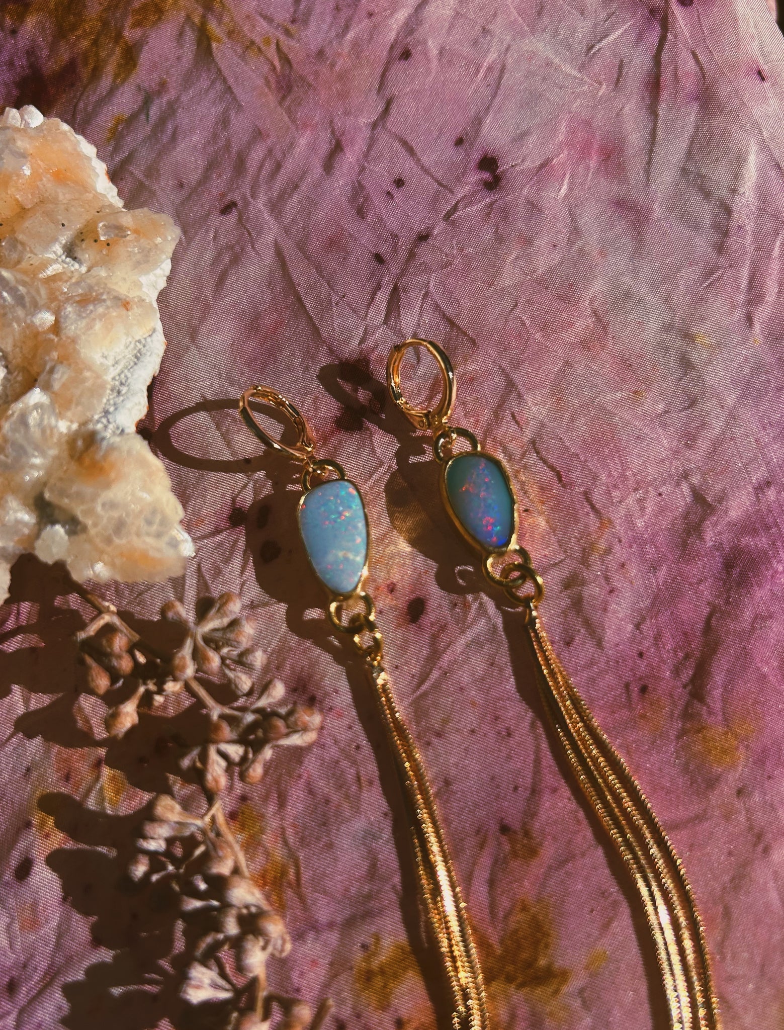 goldfill huggie hoop closures + tassel, stone itself is set in high polish jewelers brass