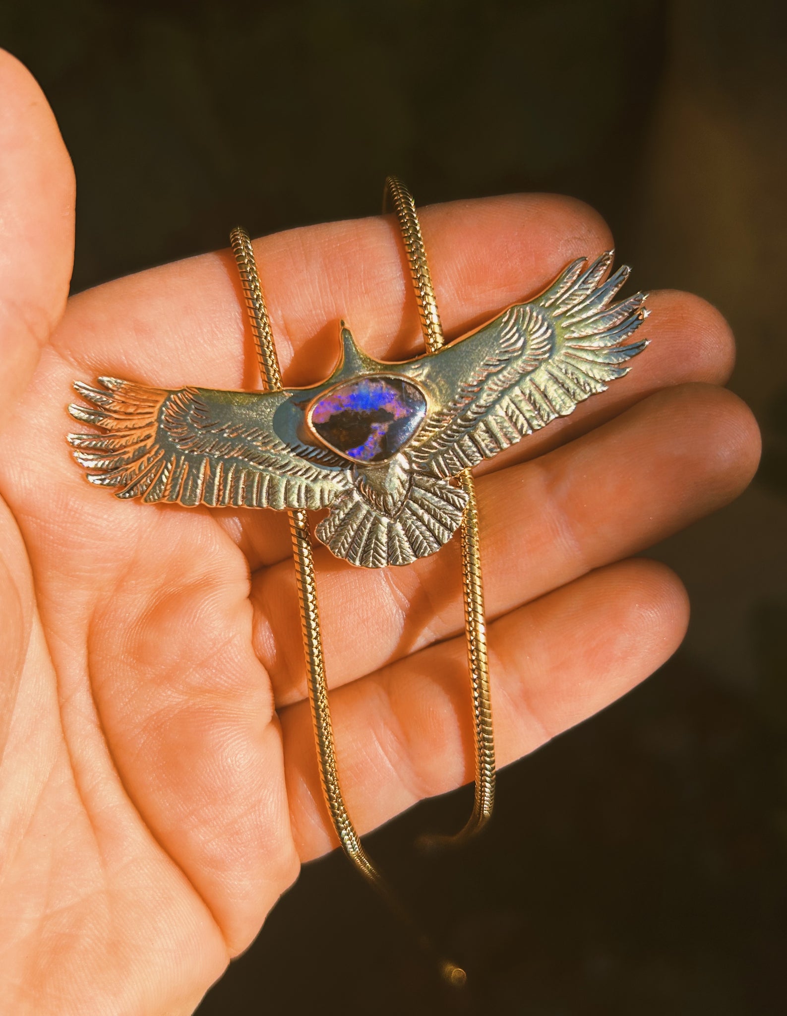 an absolute stunner through and through - gorgeous piece of purple Boulder Opal set on top of a carved brass hawk. she's got just as much protection energy as she has beauty :)