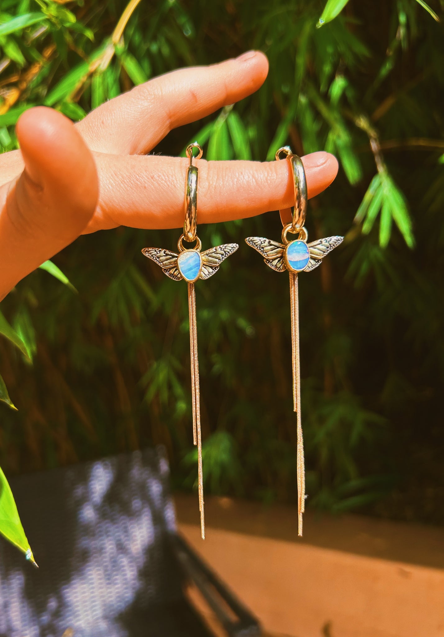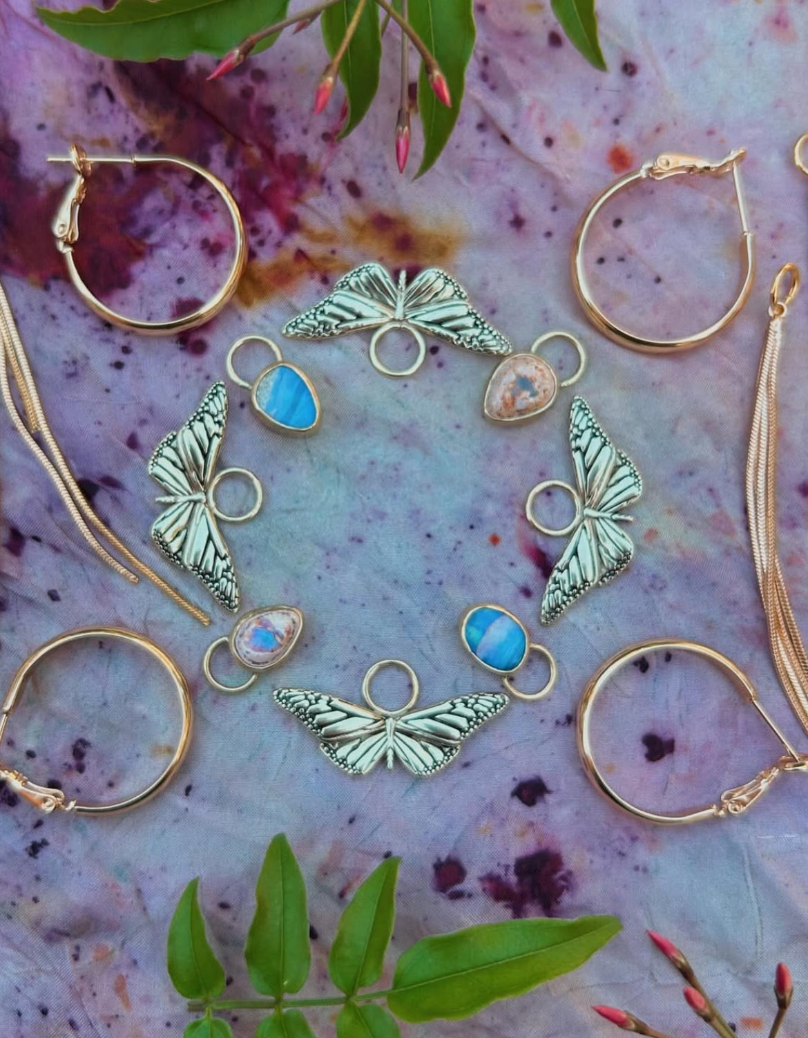 hoop and tassel are goldfill, butterfly and opal are high polish jewelers brass