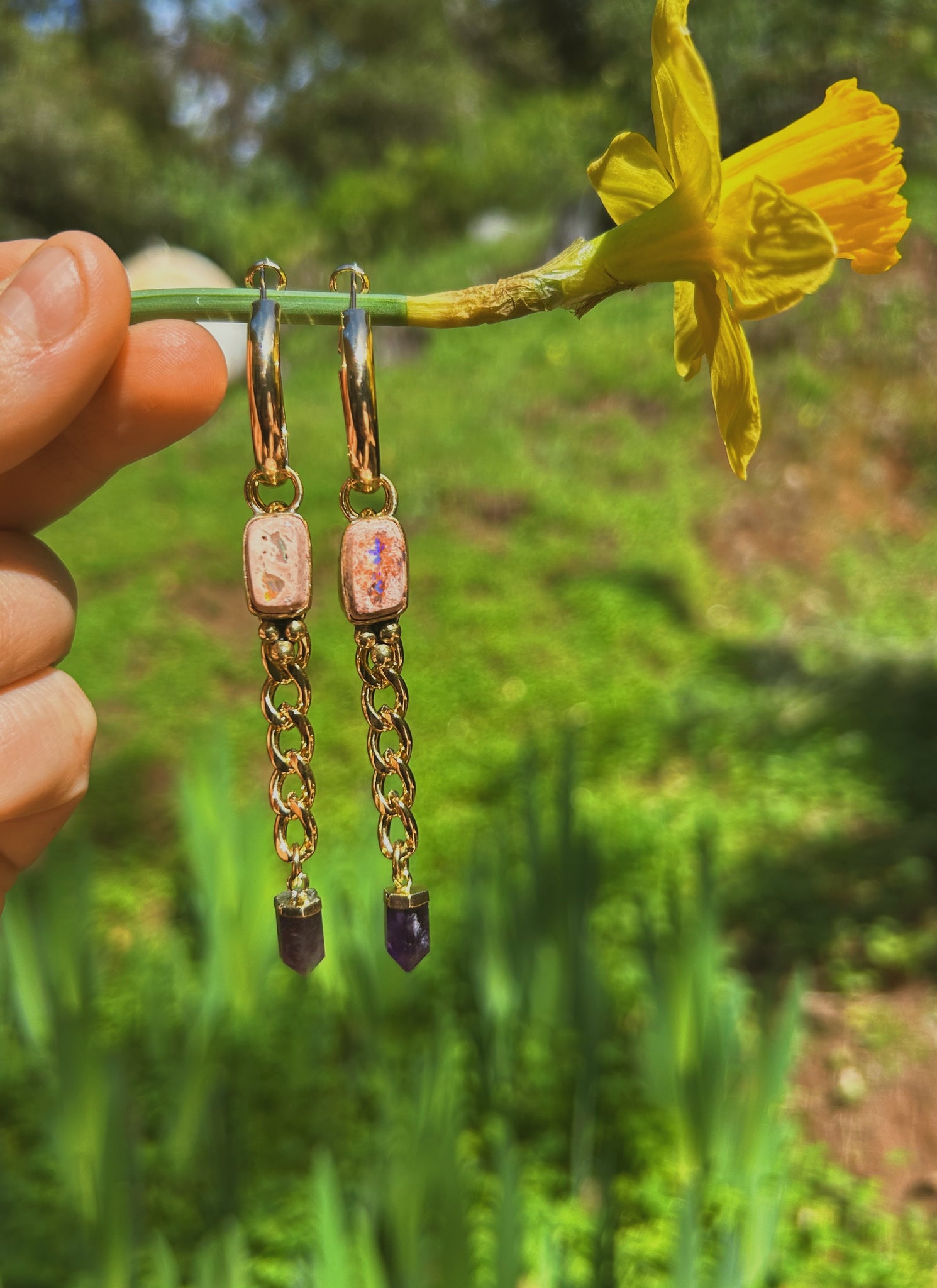 Hoop itself is hypoallergenic gold fill, all chains are gold fill and the stones themselves are set in high polish jewelers brass