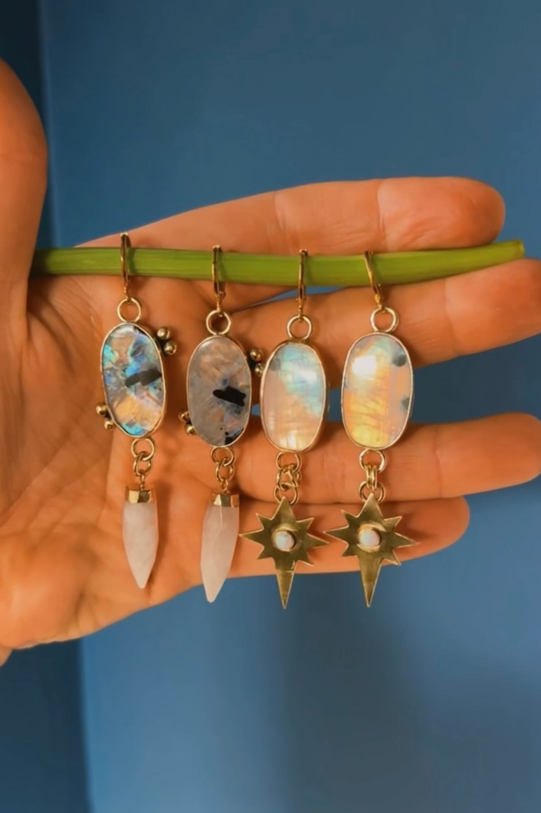gorgeous rainbow flash Moonstone with a star drop featuring a mini opal on each