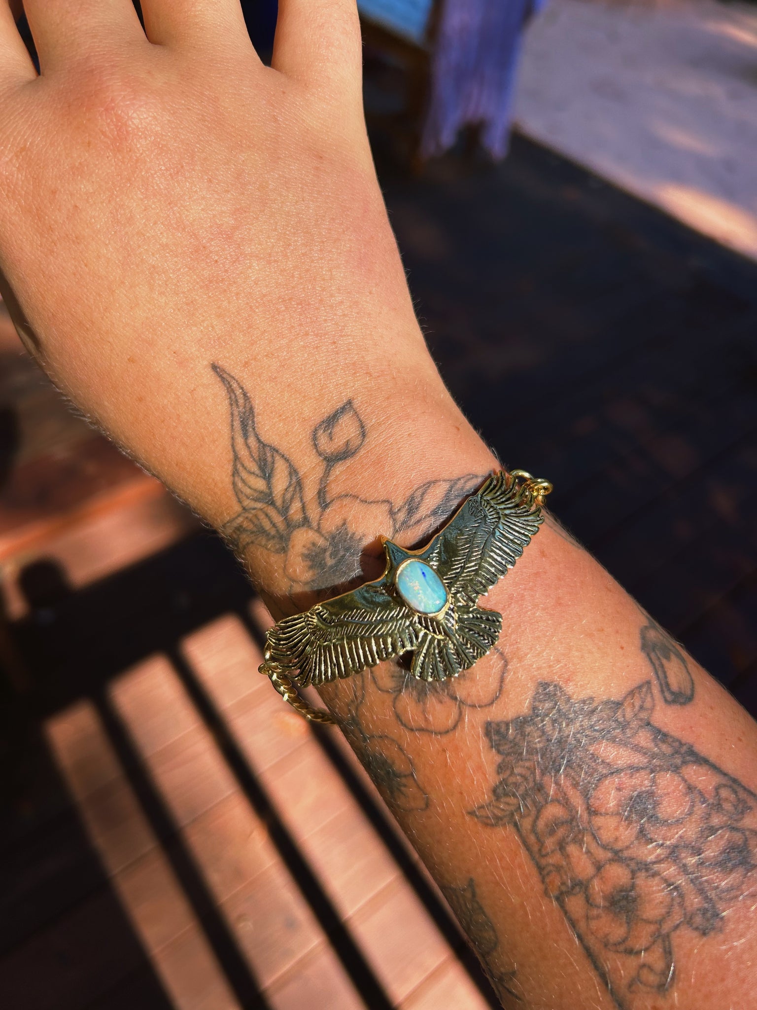 made with a juicy Australian Opal set on a talisman like hawk, finished with a goldfill Cuban Link Chain. Hawk + Opal set in high polish jewelers brass