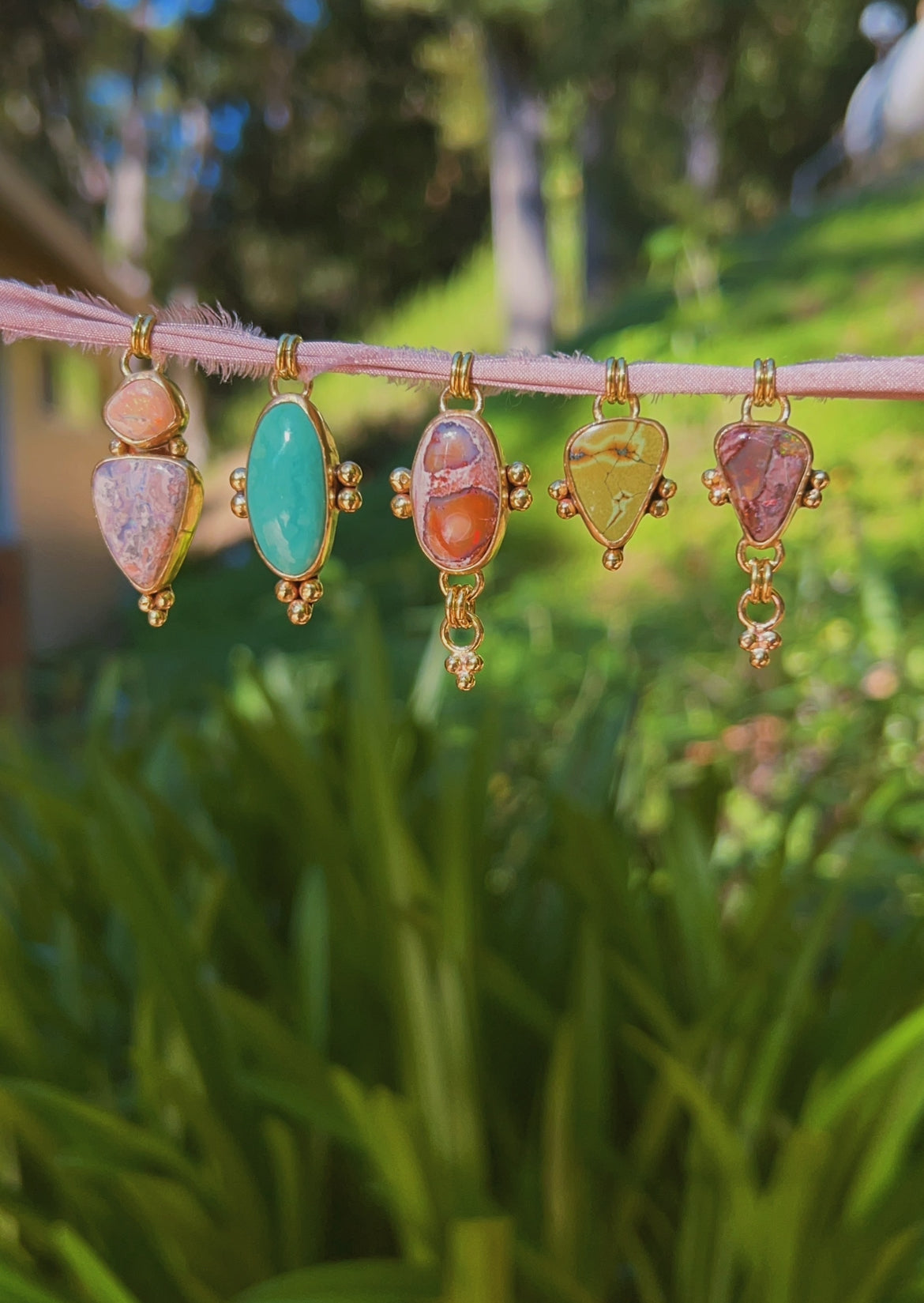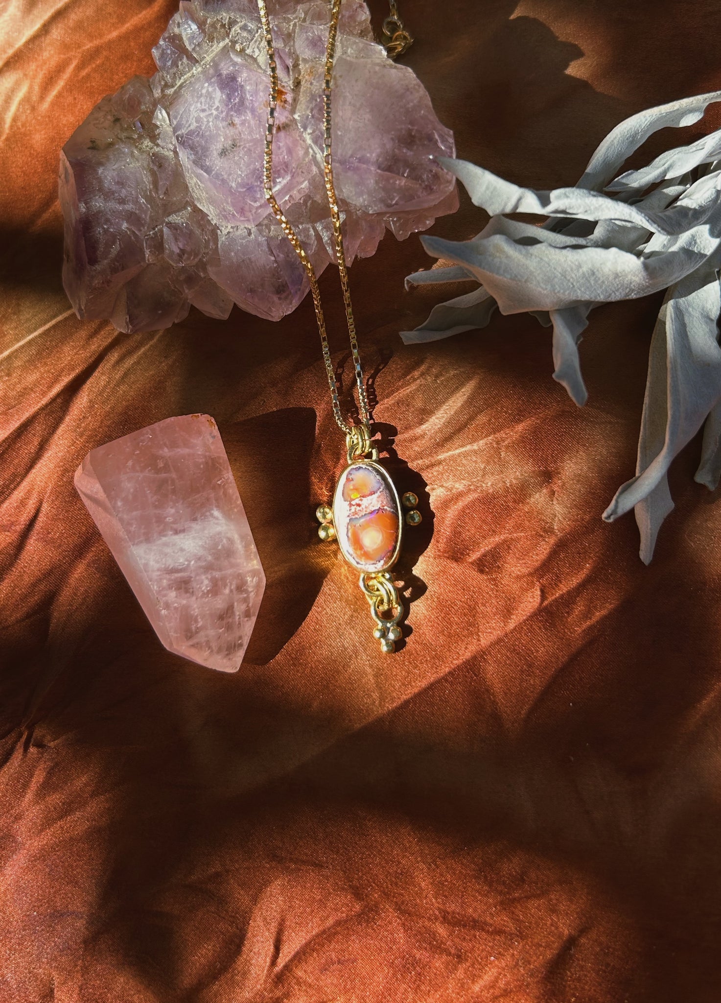 dot accents and charm drop at the bottom of a cantera opal, fabricated from high polish jewelers brass on a goldfill chain