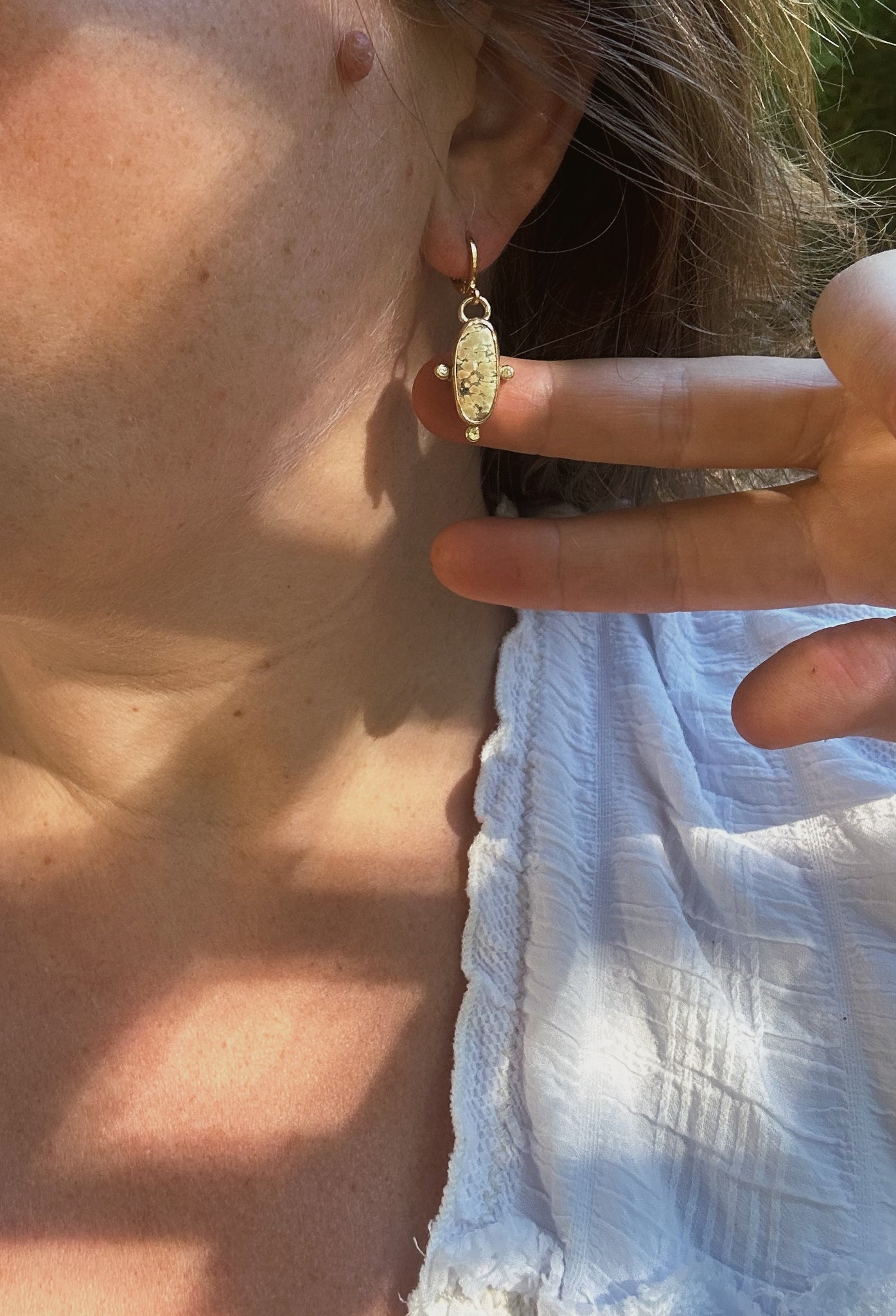 lil dot accents on stones set in high polish jewelers brass hung on goldfill hugie hoop